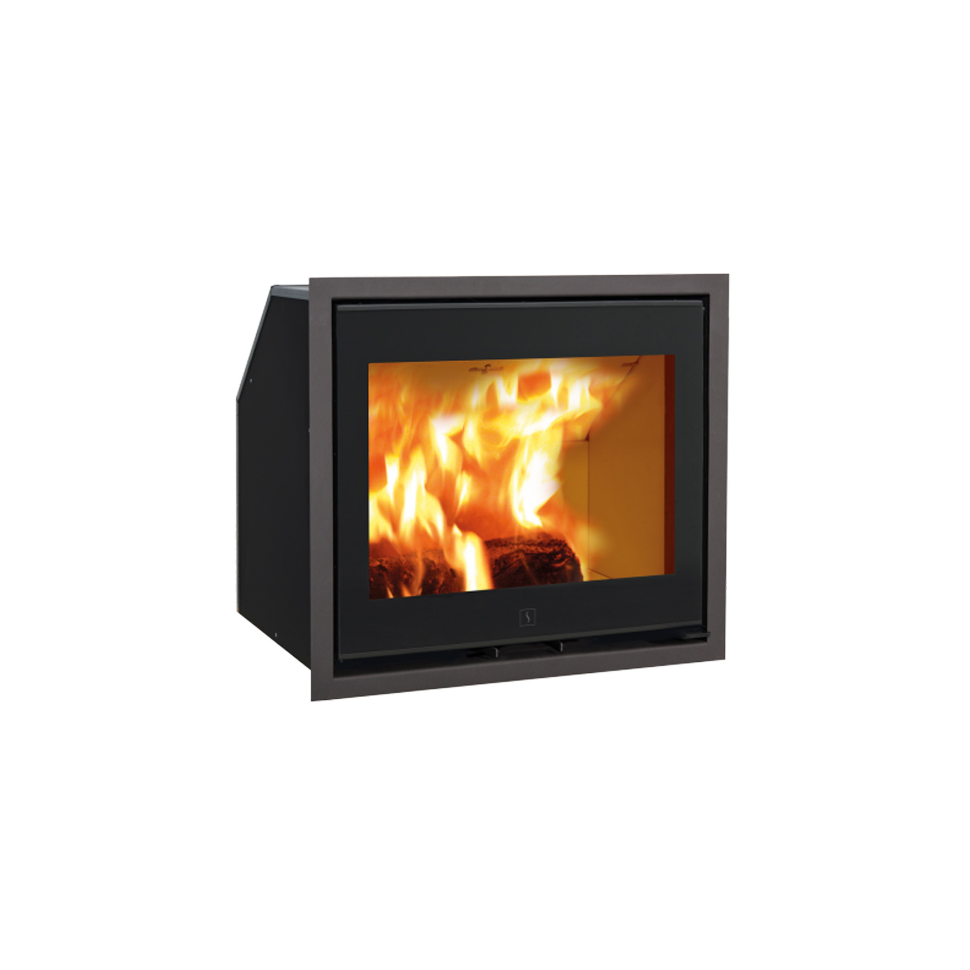 Scan 1003 ist ein kompakter Einsatz, erhältlich entweder mit weißem Glas und matten Chromleisten oder mit schwarzem Glas und schwarzen Zierleisten. Er eignet sich für Holzscheite mit einer Länge von bis zu 50 cm.