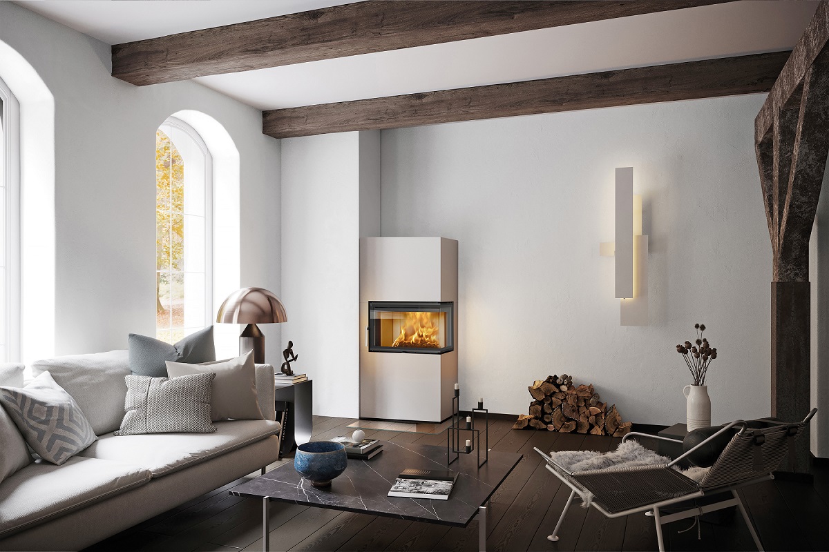 Der Scan 5107 vereint dezentes, zugleich markantes Design mit einem intensiven Flammenerlebnis: Dank der zweiseitigen Glastür genießen Sie die Flammen fast wie bei einem offenen Kamin. Die Luftzufuhr lässt sich bequem über einen einzigen Hebel steuern, während der elegante Griff und der schwarze Glasrahmen das Gesamtbild abrunden. Wählen Sie zwischen einer Ausführung mit rechts- oder linksangeschlagener Tür – ideal für eine mittige Rauminstallation oder eine Eckplatzierung. Zusätzlich bieten beide Modelle die Möglichkeit, Wärmespeichersteine im oberen Fach zu integrieren, die bis zu 12 Stunden nachlegender Holzscheite angenehme Wärme abgeben.