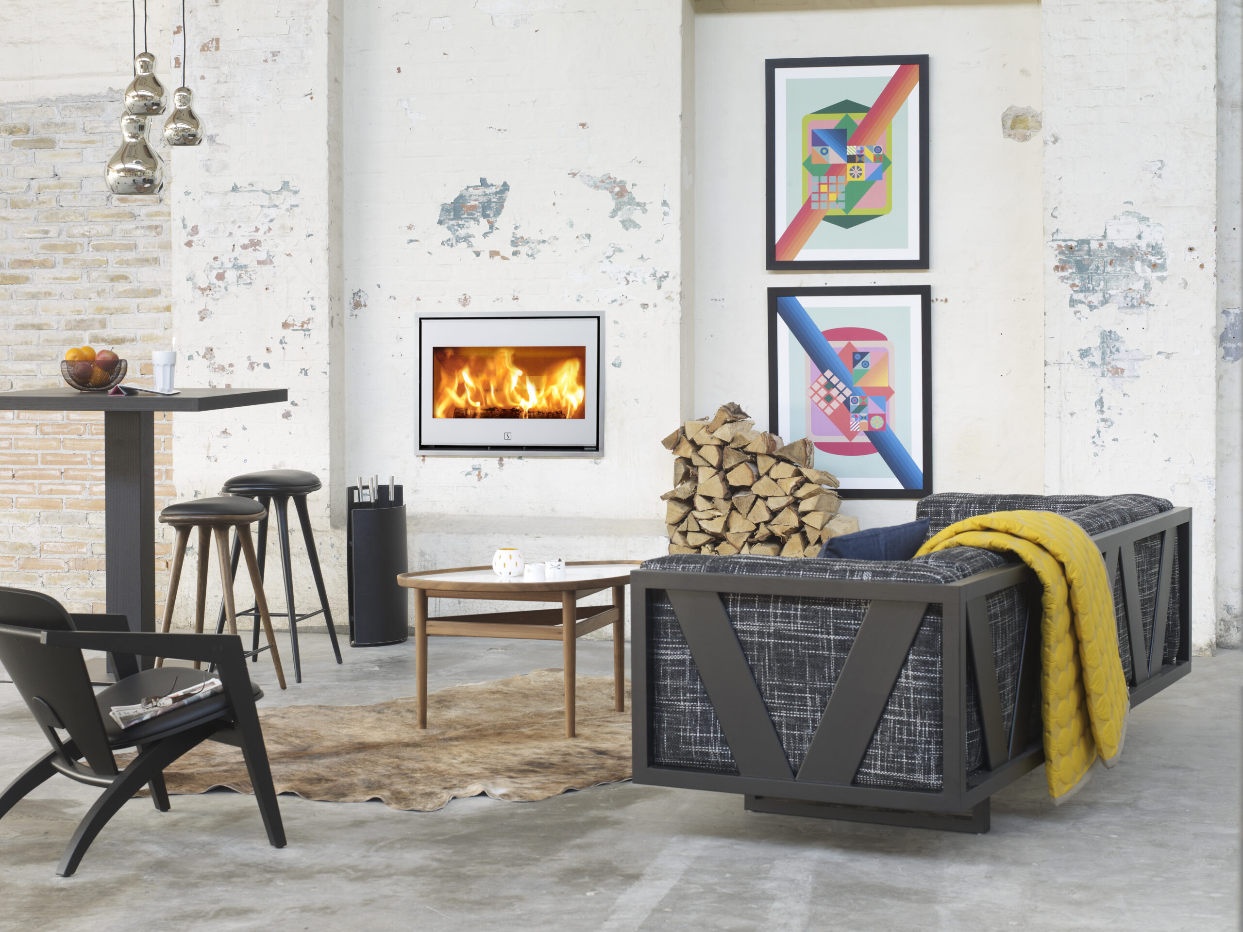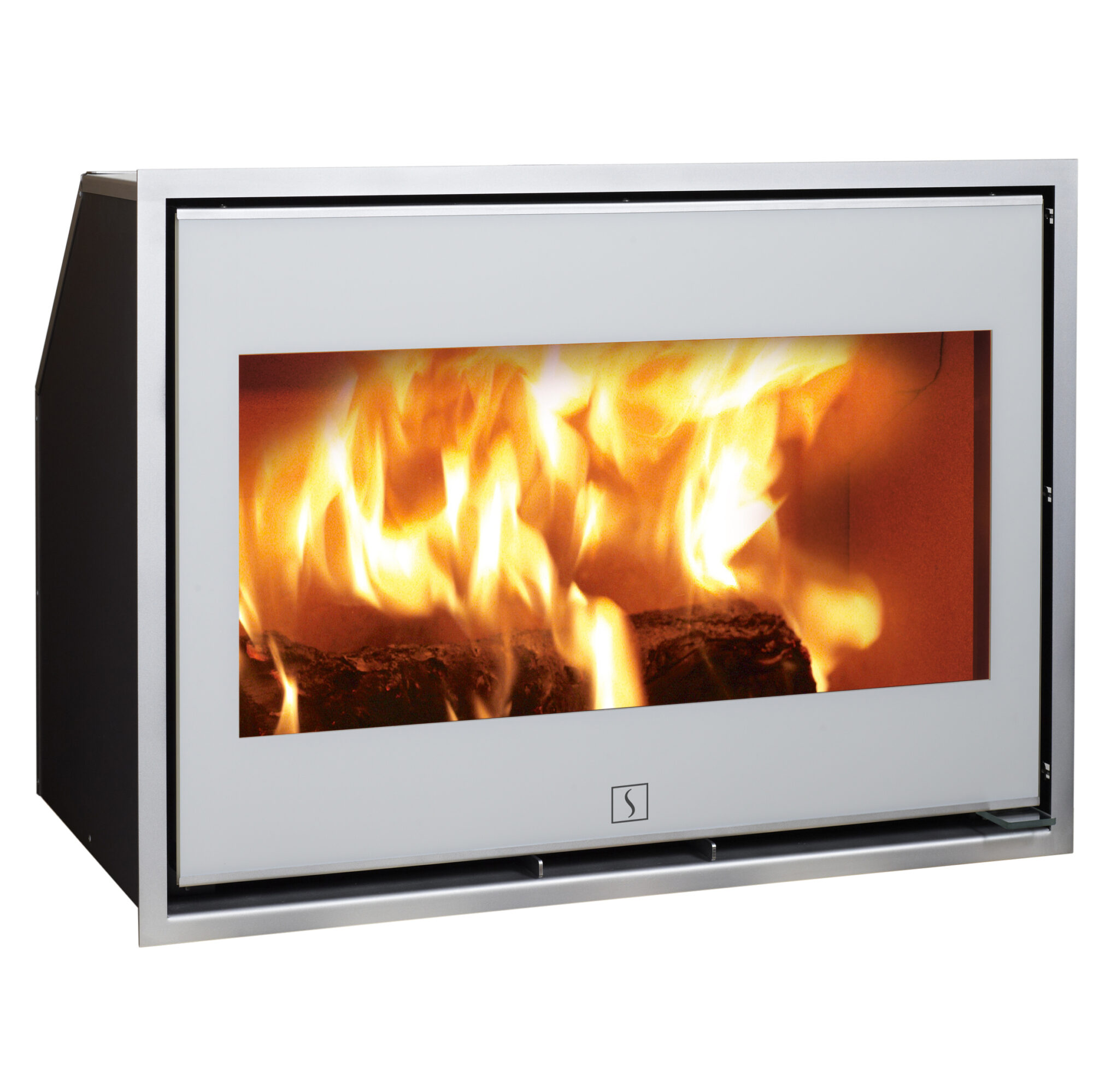 Der Scan 1002 ist ein Kamineinsatz, der ganz bündig mit der Wand abschliesst. Der Einsatz ist mit schwarzem Glas-Dekor und schwarzen Kantleisten oder mit weißem Glas-Dekor und Kantleisten in Matt-Chrom lieferbar. Scan 1001 nimmt Holzscheite bis 65 cm.